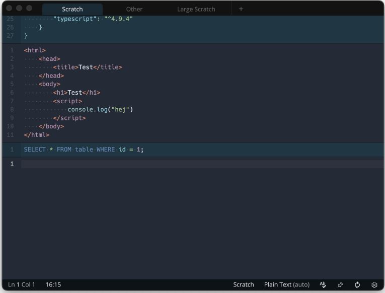 Apart from the default Scratch buffer, you can now create and switch between multiple note buffers. Ctrl/Cmd+N opens up a dialog for creating a new buffer. By pressing Ctrl/Cmd+S you can create a new note from the current block (the current block will be moved into the new note). New note buffers are saved to the note library which is basically a directory (with sub dirs) on the disk with a .txt file for each buffer. You switch between buffers by pressing Ctrl/Cmd+P.
